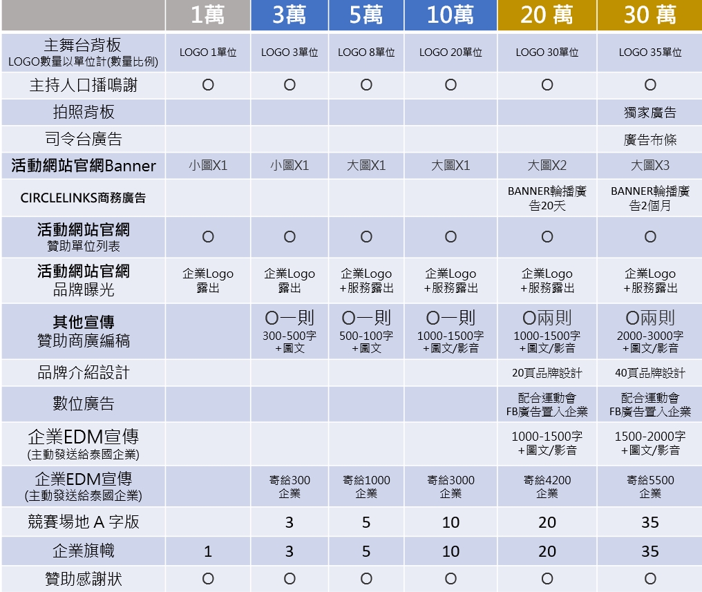 今年運動會將於11月24日在中華國際學校舉辦,預計現場人數1000人,為兩年一度的重大盛會,本次除了官網廣告、A字板…等宣傳,更有最多達3000家企業的EDM行銷,各位鄉親老闆敬請把握這難得的機會,細節附於下表,招商截止日期11月15日。