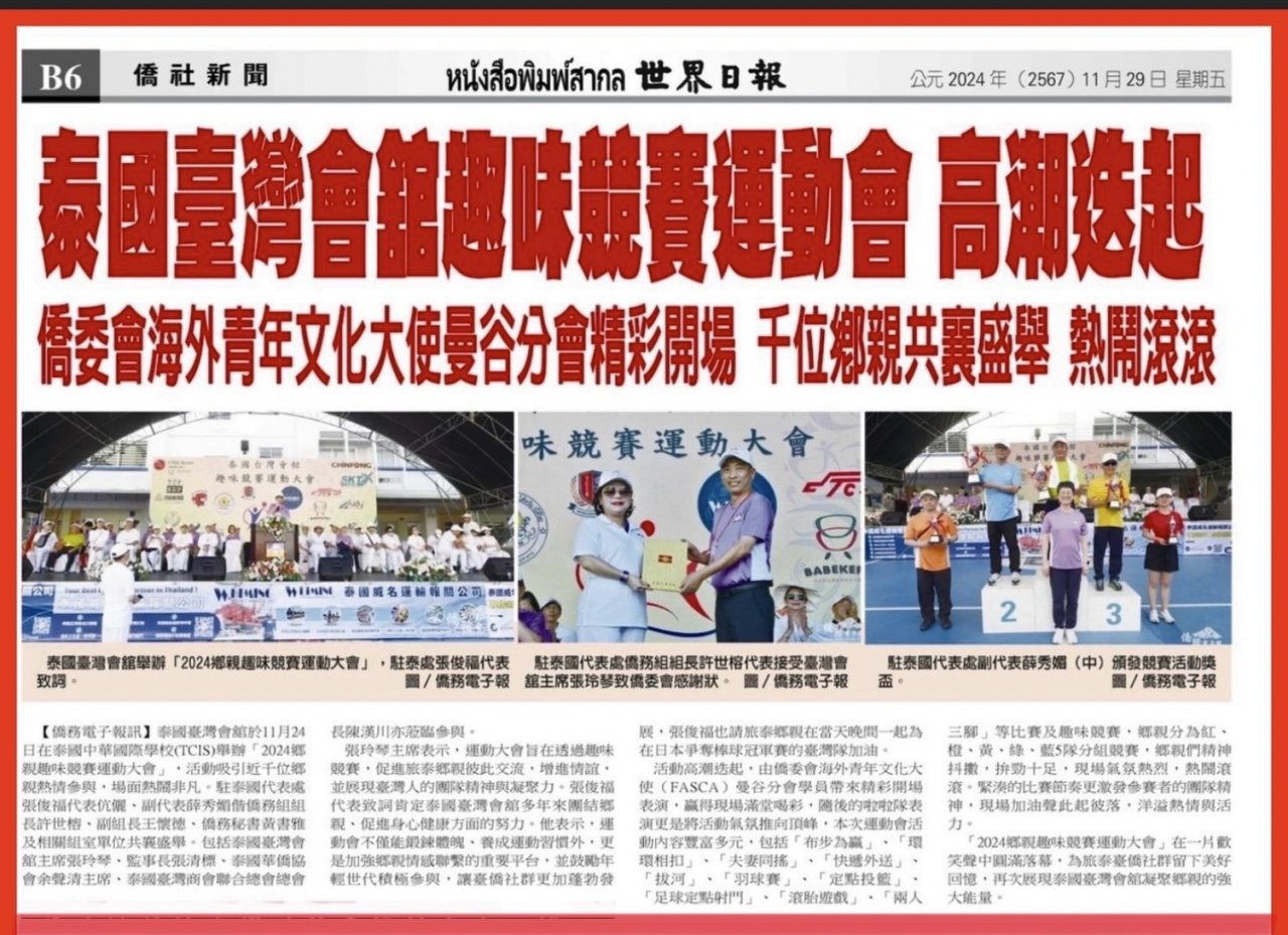 兩年一度的泰國台灣會舘《2024年鄉親趣味競賽運動大會》,於張大使俊福閣下及薛秀媚公使的見證下,於泰國中華國際學校圓滿落幕,本次大會由11個聯誼會分別組成紅、橙、黃、綠、藍五隊,來自全泰國近千名台灣鄉親前來共同競技,透過以運動會友的方式,培養鄉親之間的情誼,本次大會更受到中華民國僑委會的報導(連結: https://ocacnews.net/article/384981?cid=3 ),受到國家單位的關注是台灣會舘莫大的榮幸,台灣會舘張玲琴主席、張清標監事長、籌備主委陳俊蓁、籌備主委李奇賢感謝所有長官、貴賓及鄉親好朋友的支持,下一屆運動會將於2026舉辦,我們將秉持同等熱誠,為各位帶來更精彩更豐富的運動大會,鄉親們!我們2年後再見!